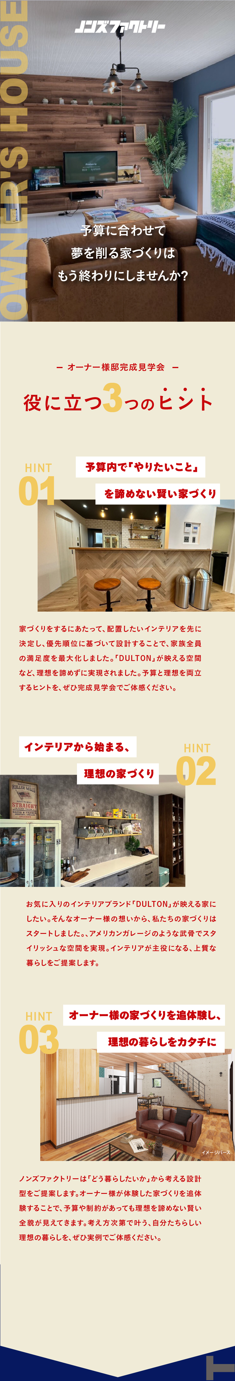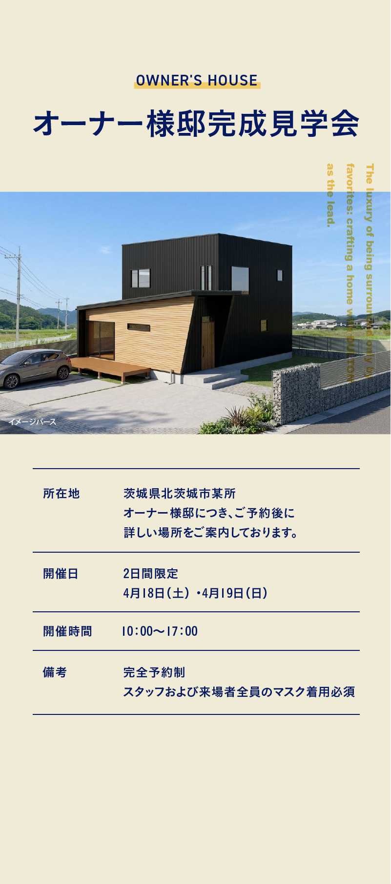 来場希望日 ※当日・前日のご予約に関しましては、お電話にてご相談ください。 ※本見学会は予約制とさせていただきます。 第一希望日 時間を選択してください10:00~11:00~12:00~13:00~14:00~15:00~16:00~ 第二希望日 時間を選択してください10:00~11:00~12:00~13:00~14:00~15:00~16:00~ お名前 ふりがな メールアドレス 電話番号 住所 郵便番号 都道府県 都道府県を選択北海道青森県岩手県宮城県秋田県山形県福島県茨城県栃木県群馬県埼玉県千葉県東京都神奈川県新潟県富山県石川県福井県山梨県長野県岐阜県静岡県愛知県三重県滋賀県京都府大阪府兵庫県奈良県和歌山県鳥取県島根県岡山県広島県山口県徳島県香川県愛媛県高知県福岡県佐賀県長崎県熊本県大分県宮崎県鹿児島県沖縄県 市区町村 番地・建物名 その他気になることがあればご自由に 下記を確認してください 弊社のプライバシーポリシーを確認する 内容を確認し、同意しました。